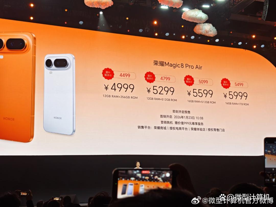荣耀商城、授权电商平台、荣耀体验店、授权零售门店现已开启预售,并于2026年1月23日10:08正式开售,首销购机赠价值999元尊享服务。