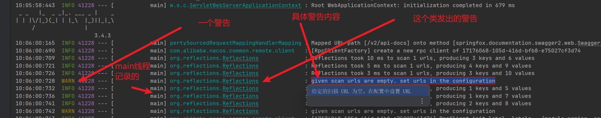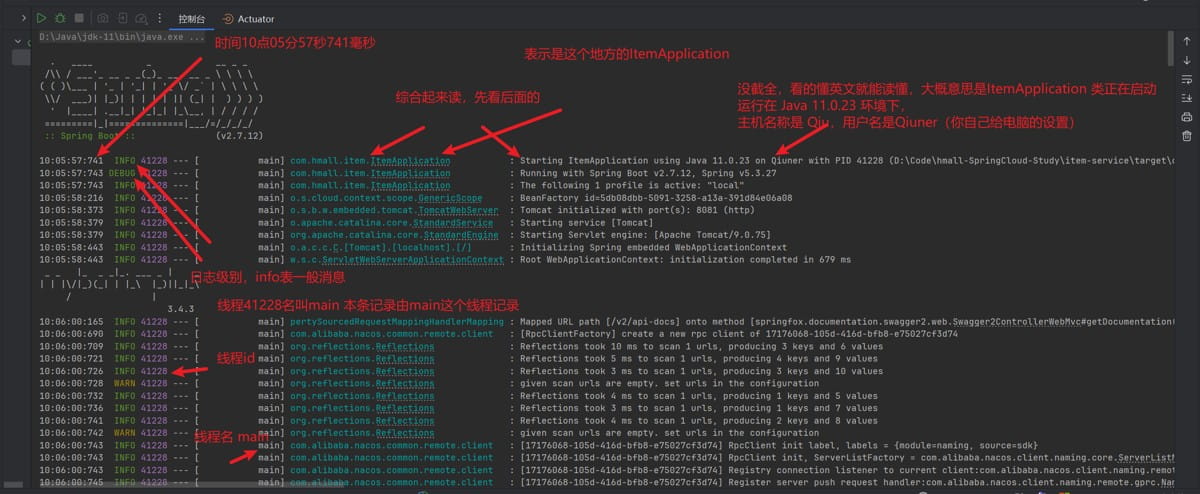 - 一条日志,告诉了我们在在 10:05:57:741 这个时间点,itemapplication 正在启动,该日志是由 main 线程记录的。itemapplication (运行配置和类文件不是一个概念)是由类 com.hmall.item.itemapplication 启动的。应用程序运行在 java 11.0.23 环境下。主机名称是 qiu(后面有 上面图片没截全)