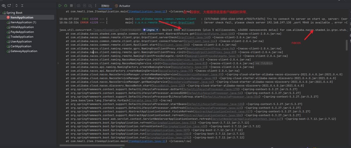 在我这个项目中,我数据库关闭了,而nacos这个依赖(如果不知道这个是什么东西,想象成一个插件就好了)的启动需要本地数据库中的数据,因此启动不成功。