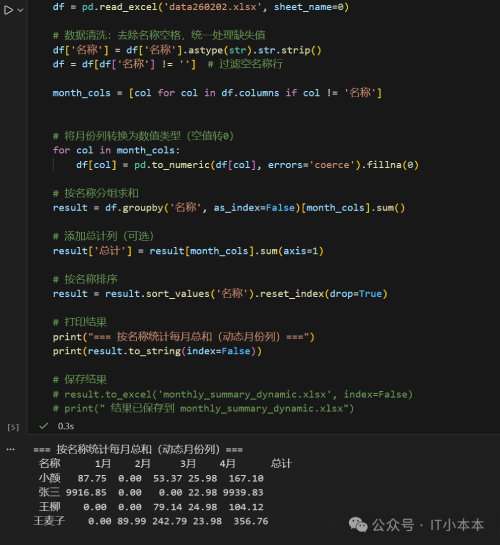 - 自动适配月份:新增“4月”“5月”列无需修改代码,只要列名不是“名称”都会被纳入计算