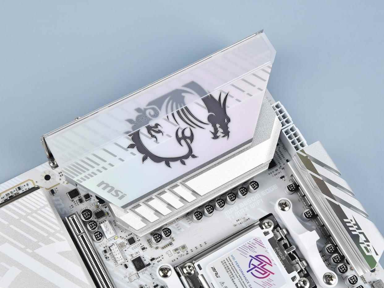 微星mpg b850m edge ti max wifi刀锋 钛主板的外观设计非常引人注目,主板整体采用银白色的主色调,辅以黑色的线条和棱角分明的散热模组,完美契合当下流行的白色主题装机风格。主板尺寸为标准matx规格(24.4cm×24.4cm),既能适配绝大多数机箱,又能为机箱内部预留充足的散热空间,兼顾兼容性与实用性。