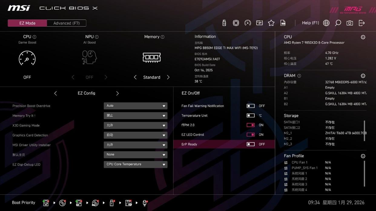 微星mpg b850m edge ti max wifi刀锋 钛升级了全新的bios,采用了全新的esa架构设计,包含gaming boost、ai boost和expo/xmp在内的一键超频,同时提供了收藏配置和安全功能,对于游戏玩家来说更加友好。