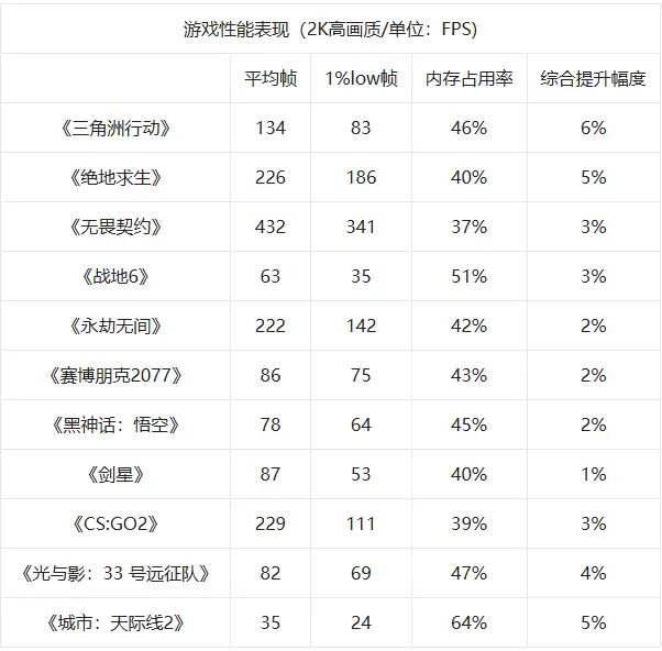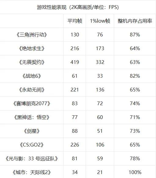 比较值得注意的是《三角洲行动》和《战地6》这两款游戏对内存容量的要求就相对比较高,内存占用率都在80%以上,甚至《三角洲行动》达到了87%,接近90%。而《城市:天际线2》作为知名“cpu压力测试”游戏,对内存容量也有很高的要求,内存占用率达到了100%,也是在我们的意料之中。