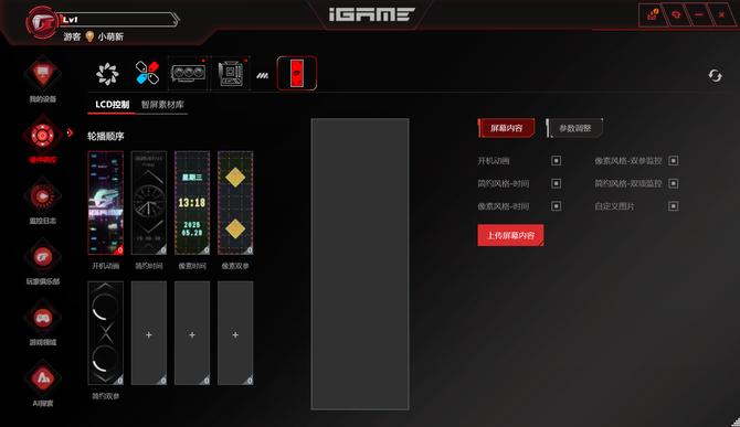 除了内置的多种图案之外,七彩虹还支持自定义图片的设置,用户根据分辨率和尺寸自由上传就ok了,整块屏幕的显示效果清晰,点亮之后非常酷炫,可玩性十足,为玩家营造非常棒的电竞氛围感觉。