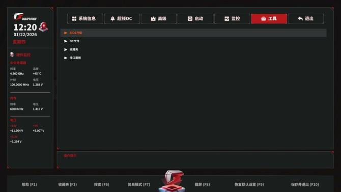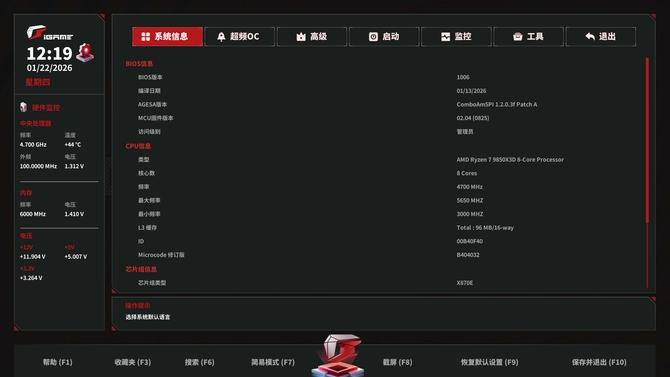 上图为默认简易模式下的bios界面,可以看到主板运行的各类信息,可视化的窗口让我们一目了然,同时黑色和红色的撞色设计,整个视觉表现非常抢眼。