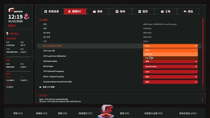 在子系统的超频选项中,我们可以对处理器的核心频率、电压等进行设置,并且加入了七彩虹首创的x3d ai高帧模式,针对amd锐龙x3d系列处理器进行专项优化,提供一键智能超频选项,以及外频预设在内的7个手动选项,相比传统pbo要调节很多参数,该模式下则是以最小时间成本和学习成本,一键优化cpu性能,提高游戏帧数。