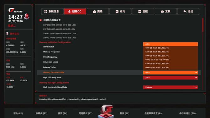 在内存超频页面中加入了可以自动调整小参的高效能模式,还有低延迟模式,并且为igame影系列或者体质较好的内存提供了多个内存超频预设。整合关联选项,带来更简单便利的超频体验。