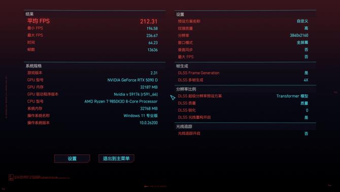 4k分辨率下,dlss质量,光追超速特效下,赛博朋克2077的游戏帧数为212.31,游戏性能表现非常出色。