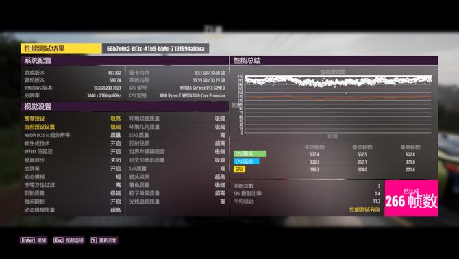 地平线5的4k分辨率游戏下,游戏帧数来到了266,性能发挥非常出色。