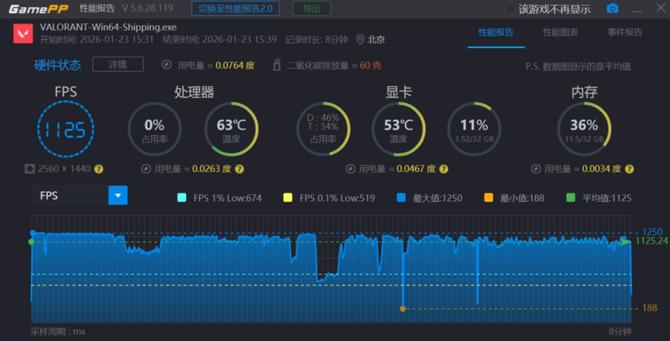 无畏契约作为当下非常火爆的游戏,在这款游戏上,我们同样选择1080p分辨率进行测试,训练场的游戏帧数来到了1200fps+,平均的游戏帧数为1125fps,轻松突破千帧,游戏性能表现出色。