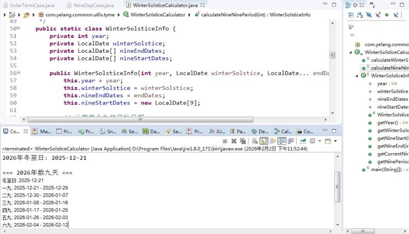 }代码采用单一职责原则设计,wintersolsticecalculator作为工具类提供静态计算方法,内部类wintersolsticeinfo专门封装数九天相关数据,实现了计算逻辑与数据存储的分离。