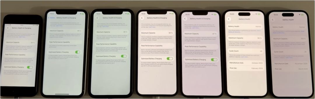 测试时检查这7台手机的电池健康度分别为:84、89、89、88、87、99、100
