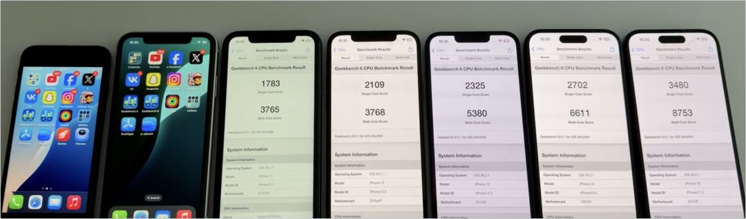 在本次测试中,iphone xr 升级到 ios 18.7.4,其它 6 款升级到 ios 26.2.1