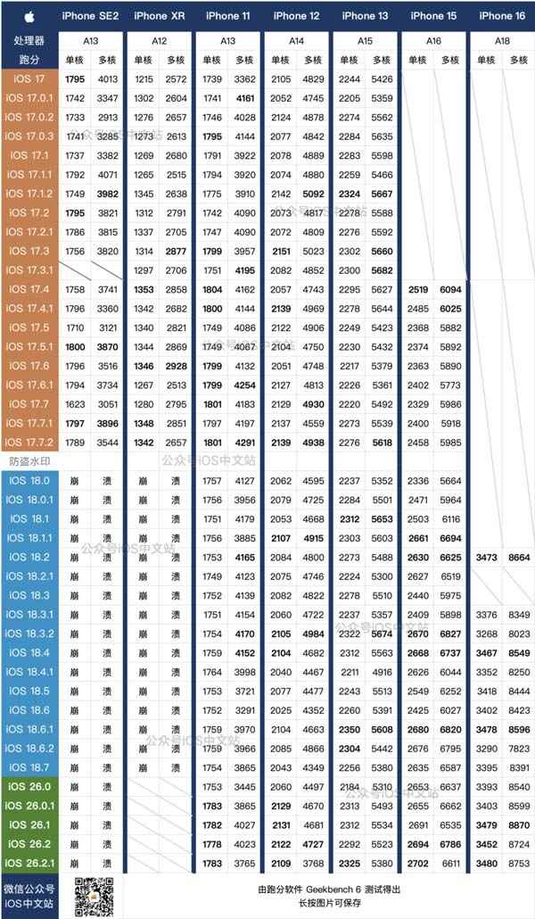 ios26.2.1 的跑分测试表现出了惊人的一致性: