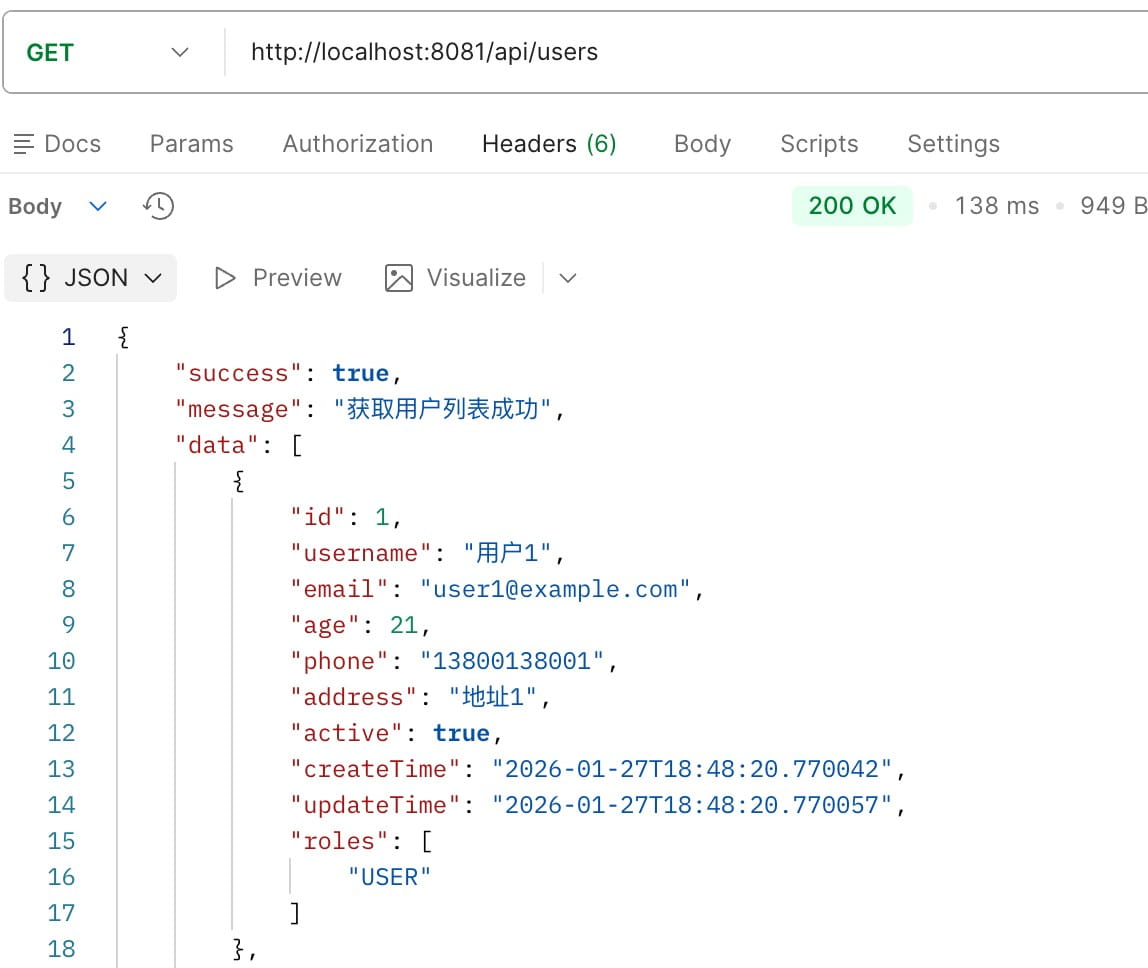 接下来实现获取所有用户信息的接口。当用户数量较多时,直接返回所有用户可能导致性能问题,但在开发阶段,这个功能对于测试和数据验证非常有用。