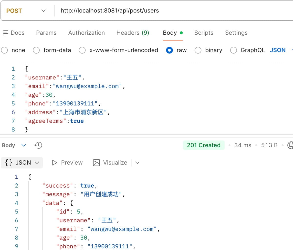 }使用 postman 测试: 通过postman发送post请求到创建用户接口,可以验证接口功能是否正常。