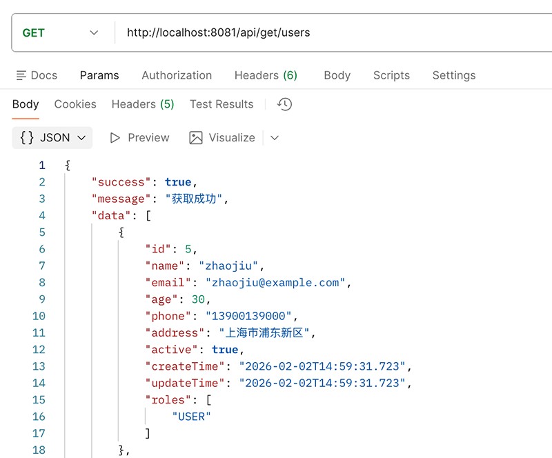 使用 postman 测试: 通过postman测试获取所有用户接口,可以查看当前数据库中的所有用户信息。
