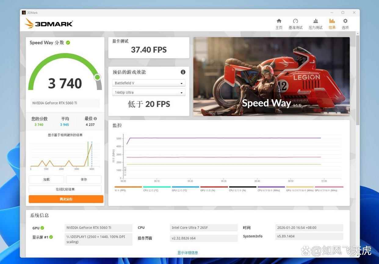 3dmark speed way测试,3740分。它是一项基于directx 12 ultimate 的图形基准测试,主要用于评估游戏pc在运行现代光线追踪游戏时的性能。 专注于测量显卡在实时光线追踪场景下的表现,包括光线追踪反射、实时全局光照、网格着色器和体积照明等directx 12 ultimate功能,模拟次世代3a游戏的视觉效果和性能需求。