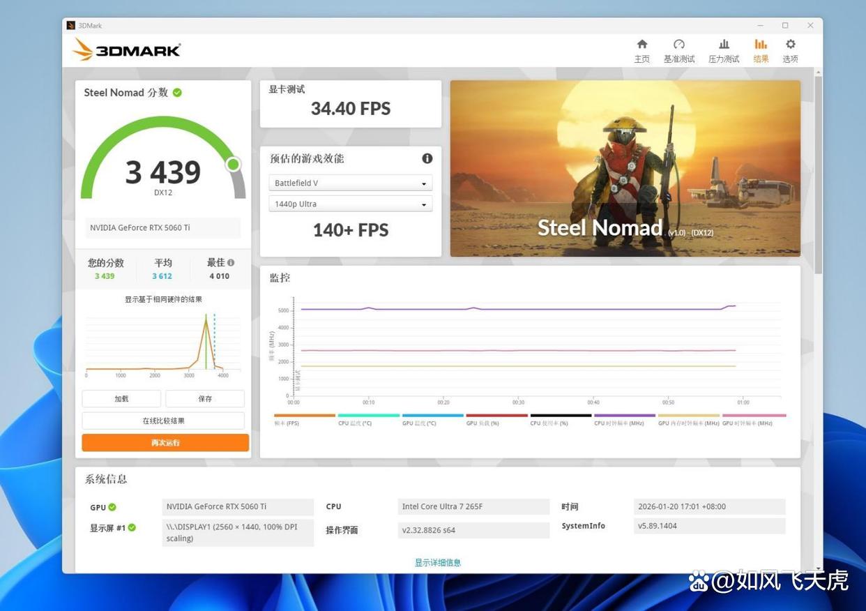 3dmark steel nomad测试,总分3439分。它是专注于评估硬件在非光线追踪(即传统渲染)场景下的游戏性能。该测试采用directx 12图形api,原生分辨率为4k,负载强度约为time spy的3倍,能更真实地模拟未来高要求游戏对gpu的压力。
