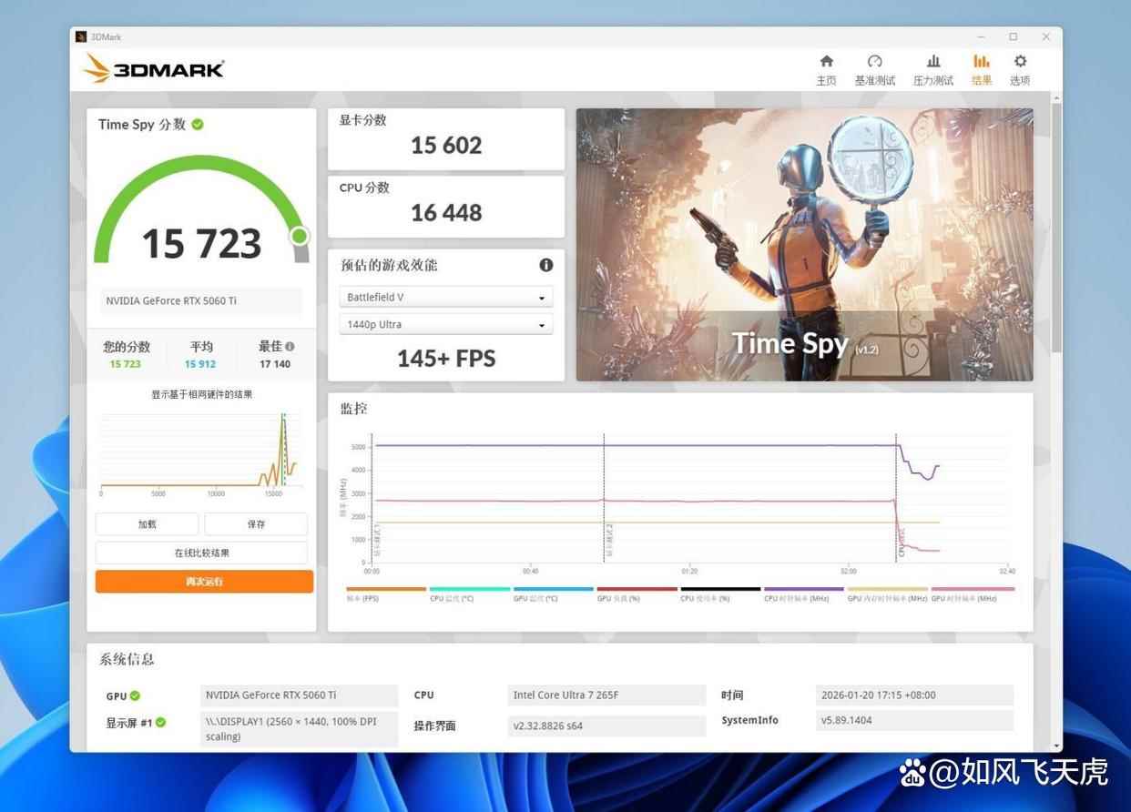 3dmark time spy测试,总分15723,其中显卡得分15602,cpu得分16448。它是一款专门测试计算机图形性能的基准软件,专注于评估硬件在directx 12 api环境下的游戏表现。其中标准版 time spy 使用 2k 渲染分辨率,而 extreme 版本则采用 4k 渲染分辨率以模拟更高负载。