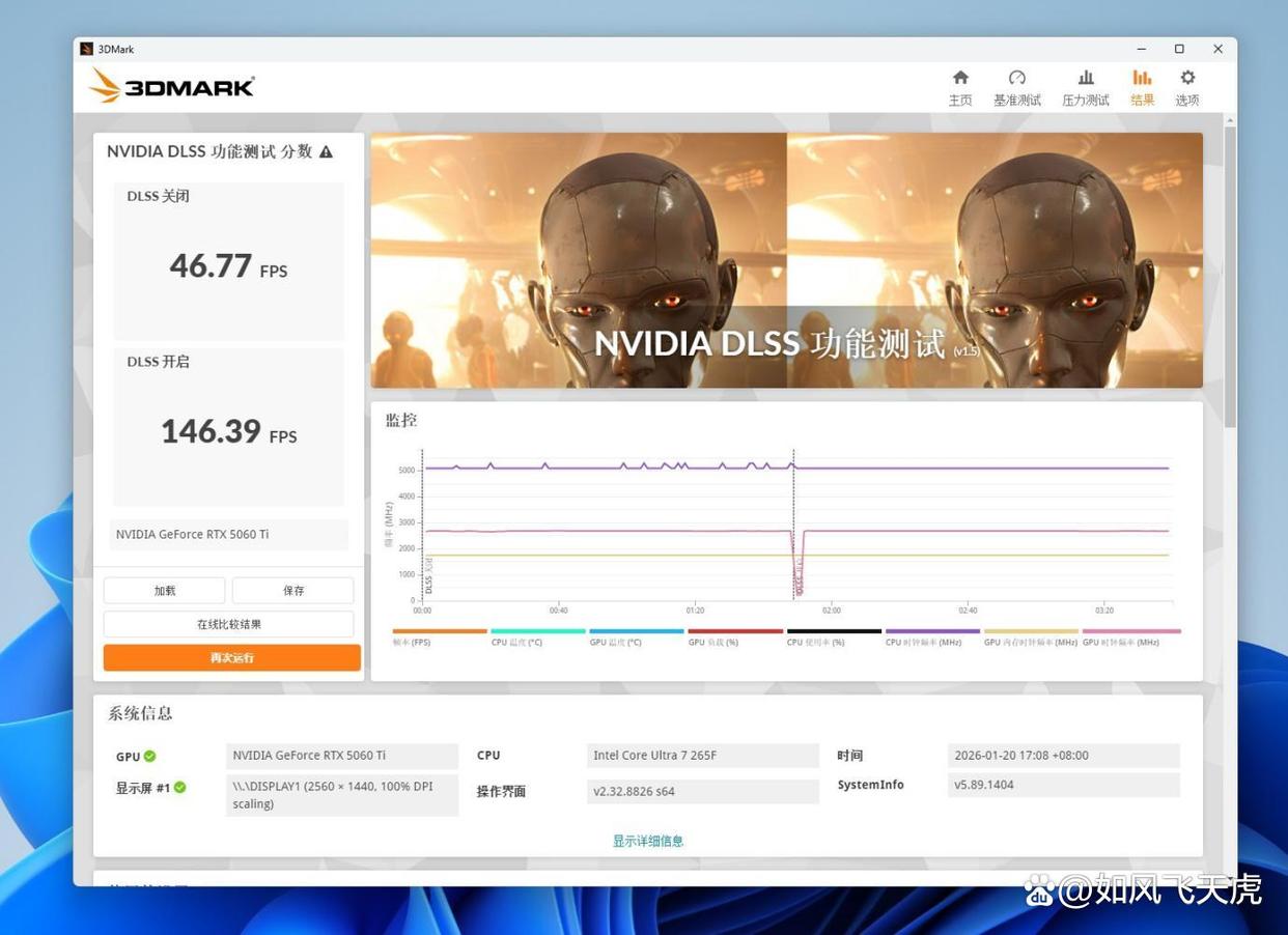 nvidia dlss功能测试,dlss关闭是46.77帧,而开启dlss后,则是146.39帧,大幅提升。