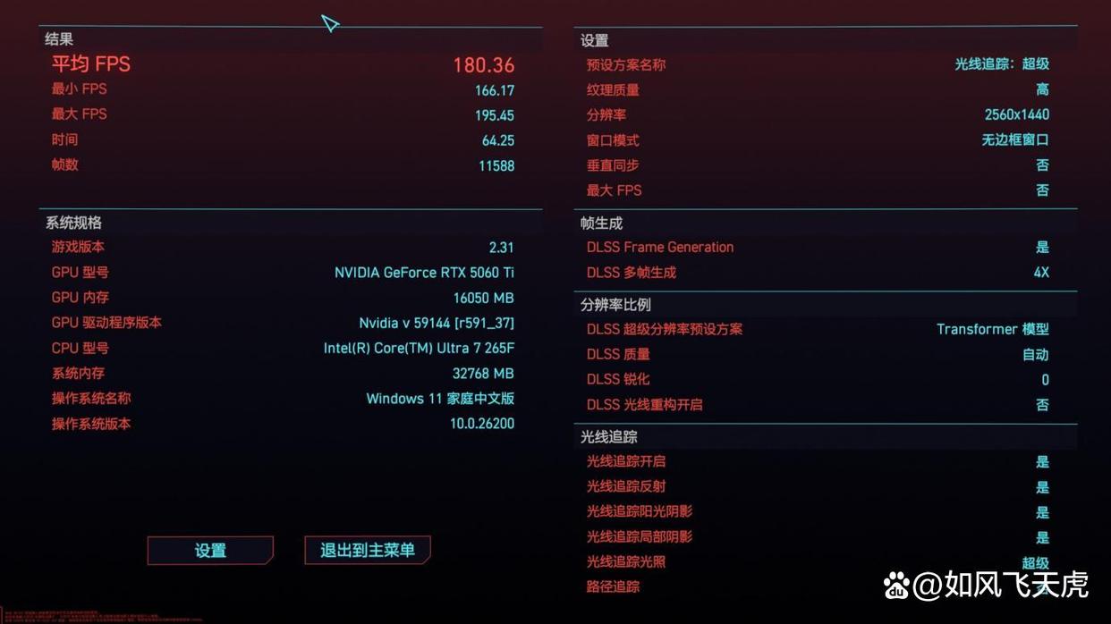 3a 大作赛博朋克2077,在2k分辨率下,光线追踪:超级预设方案,启用dlss和帧生成。平均fps达180.36帧,最小fps166.17,最大fps195.45,畅玩无压力。