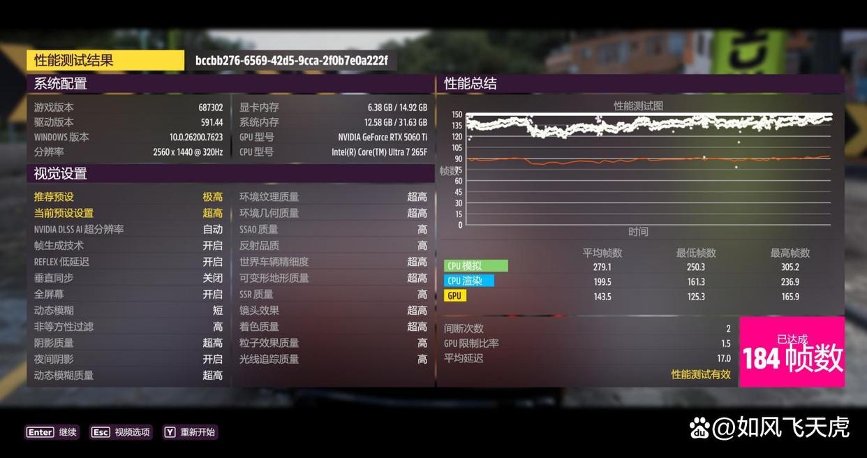 地平线5,采用极高预设,实测达成184帧,其中cpu模拟平均279.1帧,cpu渲染平均199.5帧,gpu143.5帧。