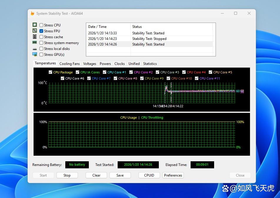 aida64 fpu拷机测试,cpu温度持续稳定在60°c左右。