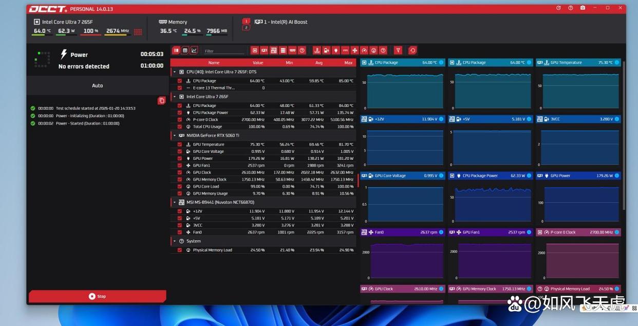 occt 压力测试模式power,实现cpu和显卡双烤,cpu功耗在65w附近波动,温度在64°c附近,显卡功耗为180w,温度在75°c附近,对于小机箱来说,这个表现十分出色。