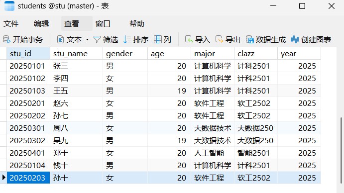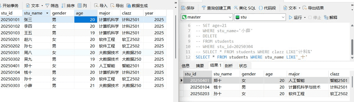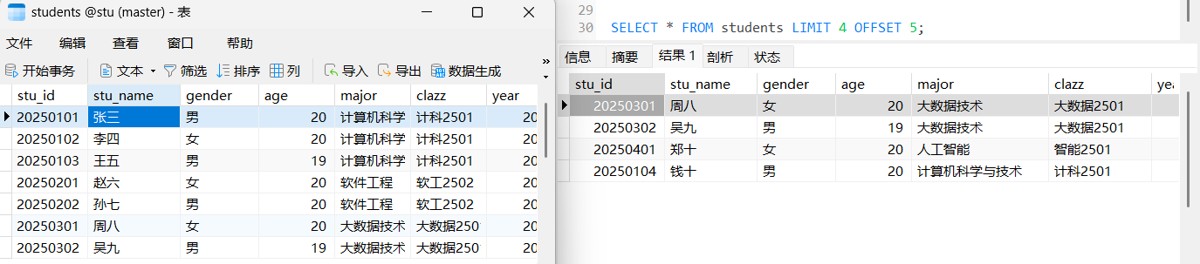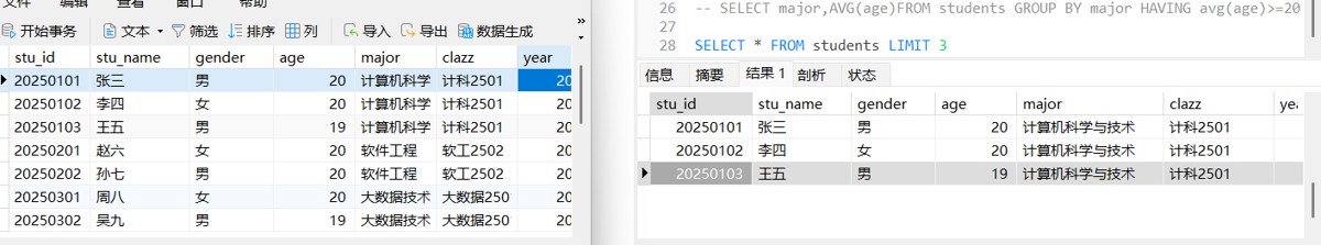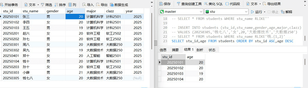 这里我们需要注意的是,如果要求对两列及以上进行排序,那输出结果是优先以第一个列先满足排序要求,,就像这里的age我们设置的是降序,但是19在20上面是因为,stu_id是按照降序排列,20250103在20250104前面