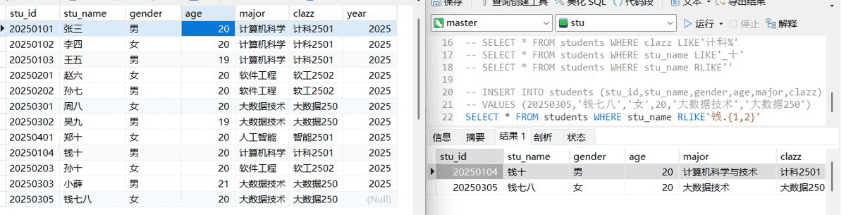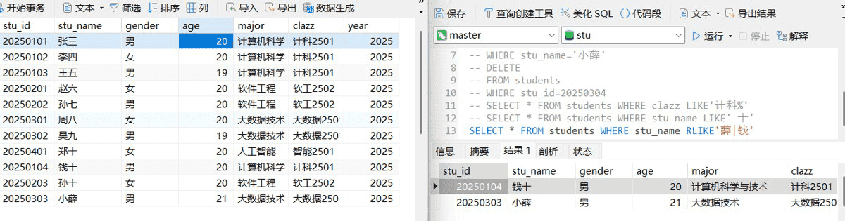 rlike,寻找名字里带薛和钱的信息,|这里表示或