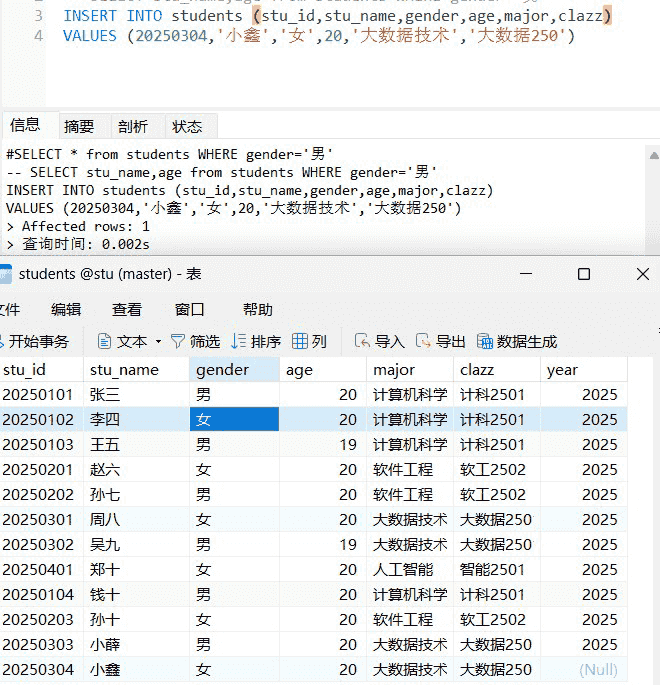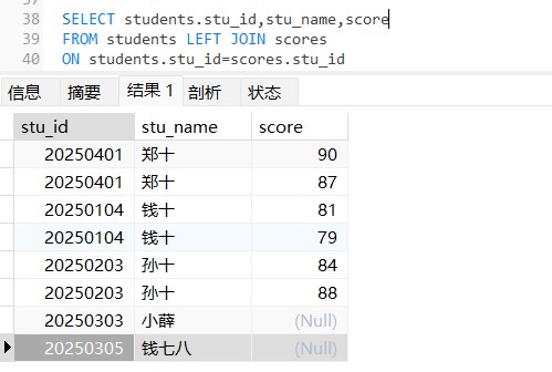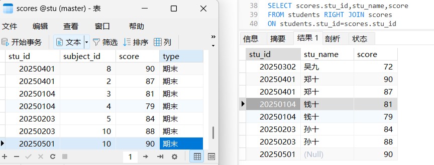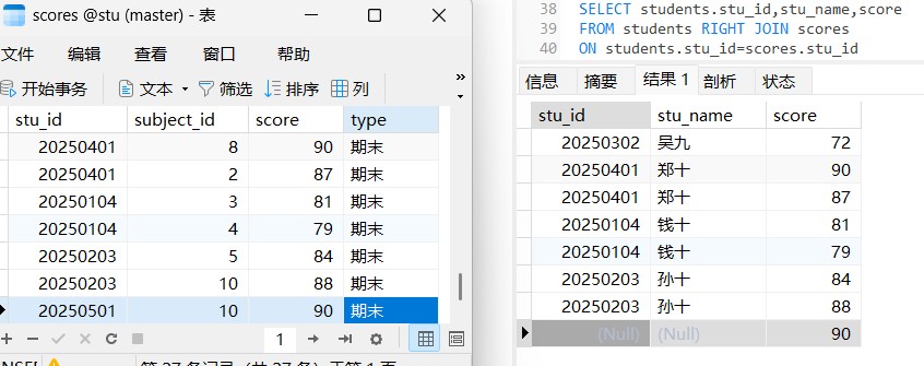 这样输出即时students中没有这个stu_id的学生也会输出,但是会出现下面两种情况,这是因为,我们select的表用一个stu_id列我们选择输出哪个表的stu_id有关,students表中可没有20250501这个学号所以输出当然是null,这一点容易混淆