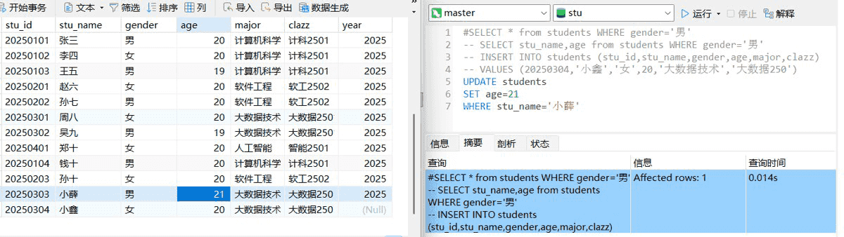 set后是需要修改的内容,where后面加条件确定是哪一行需要做出更新,这里我们就是把表中‘小薛’的年龄从20改成了21(ctrl+/键也能达到注释的效果)