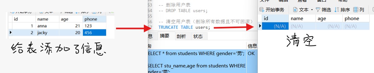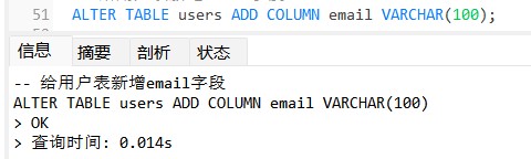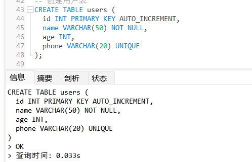 -- 创建用户表 create table users ( id int primary key auto_increment, name varchar(50) not null, age int, phone varchar(20) unique ); -- 给用户表新增email字段 alter table users add column email varchar(100); -- 删除用户表 drop table users; -- 清空用户表(删除所有数据且不可回滚) -- truncate table users;