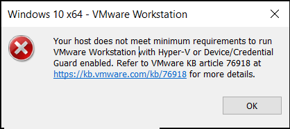 vmware workstation 在启动失败时会明确提示:由于检测到 hyper-v 或已启用“设备 / 凭据防护”(device / credential guard),导致宿主机不满足运行虚拟机的最低要求。