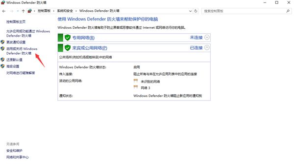 打开它之后,就可以看到目前电脑系统的防火墙是处于打开的状态,然后点击左侧的“启用或关闭windows defender防火墙”选项