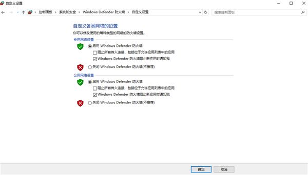 都改成“关闭windows defender防火墙”,最后点击“确定”