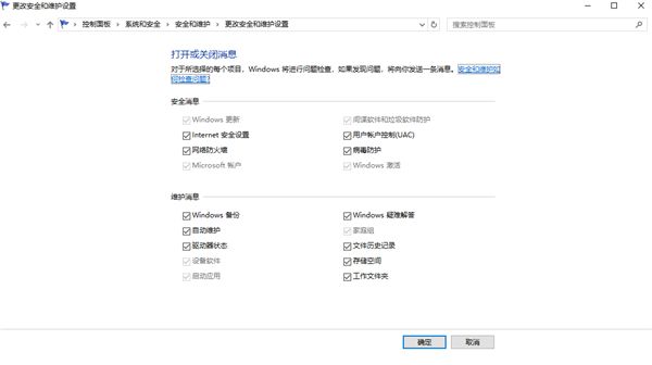 先点击更改安全和维护设置 → 把 安全设置、用户账户控制、网络防火墙、病毒防护 全部取消勾选点击确定