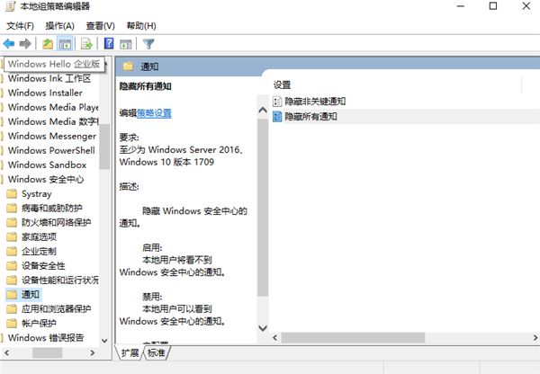 接着点击“管理模板/windows组件/windows安全中心/通知”进行以下一项操作