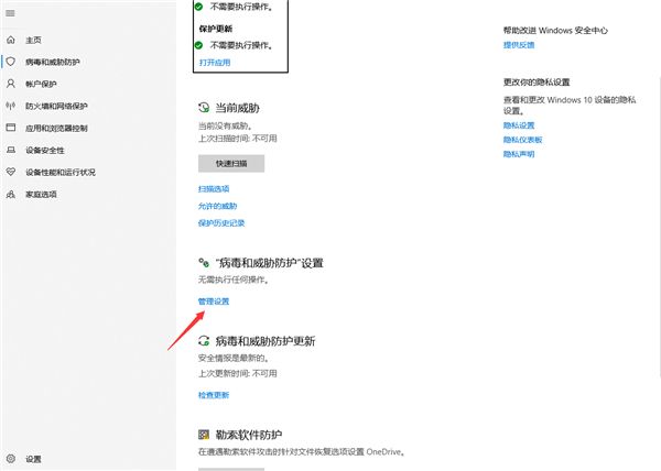 打开windows安全中心,左侧边栏,点击病毒和威胁防护,找到并点击“病毒和威胁防护”设置下的管理设置