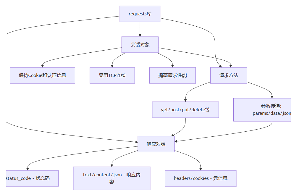 这个图表展示了requests库的核心概念及其关系:请求方法用于发送请求,响应对象用于接收和处理服务器的回应,而会话对象则在多个请求之间提供状态保持和连接复用。
