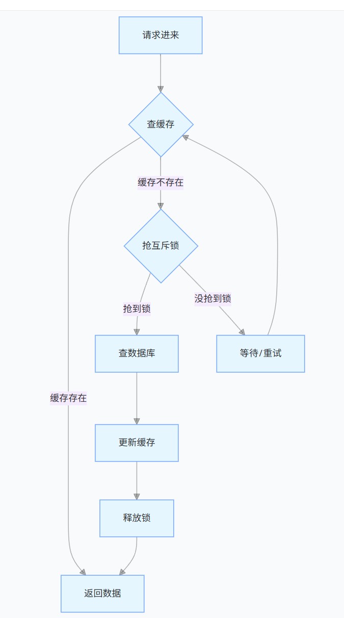 缓存物理过期(redis 自动删)→ 请求进来发现缓存空 → 抢锁 → 抢到锁的查数据库、更新缓存 → 没抢到锁的等待 / 重试 → 最终拿到新缓存数据。