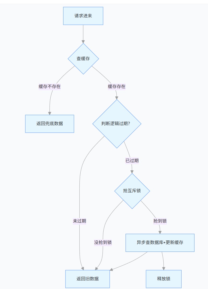 - 核心优势:无论是否抢到锁,都立刻返回旧数据,接口无阻塞,只有 1 个异步线程去更新缓存。