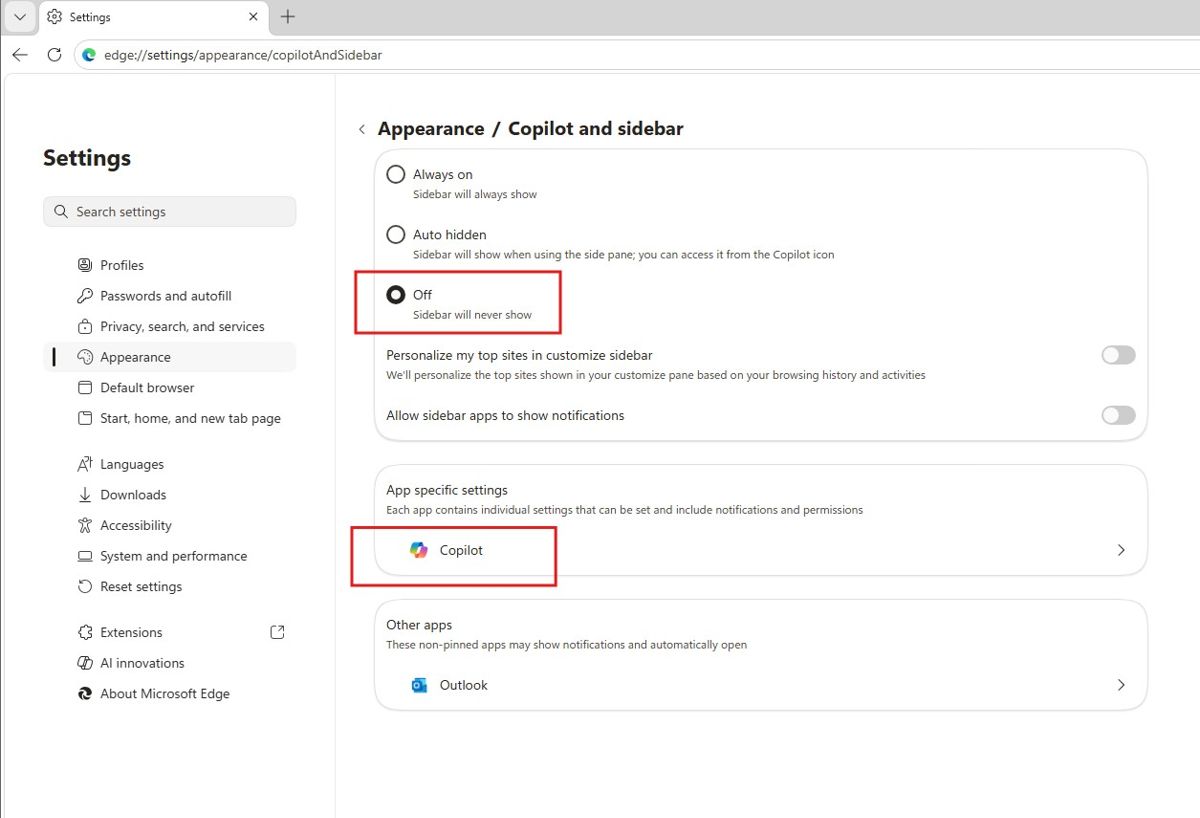 2、在左侧菜单中选择“外观”,向下滚动页面,选择“copilot 侧边栏”。