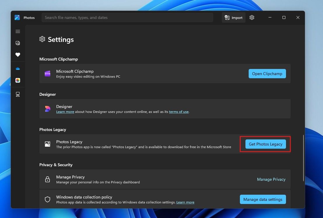 3、向下滚动页面,点击“获取照片(旧版)”按钮。