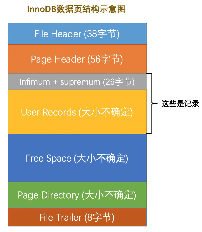 根据结构示意图,我们可以看到,在这16kb的数据里,除了包括我们要记录的数据,还包含页头和页尾的开销(大约200字节)。因此,一个数据页中的有效数据空间大概为16184字节。