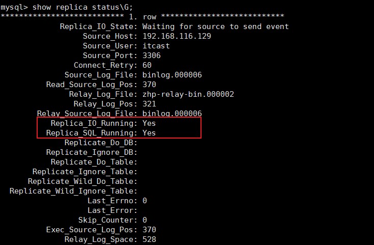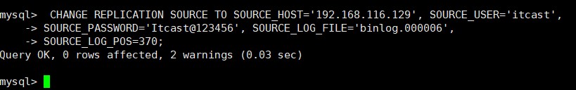 change replication source to source_host='192.168.116.129', source_user='itcast', source_password='itcast@123456', source_log_file='binlog.000006', source_log_pos=370;