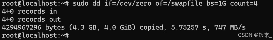 sudo dd if=/dev/zero of=/swapfile bs=1g count=4 # count=4表示创建4个1gb的块