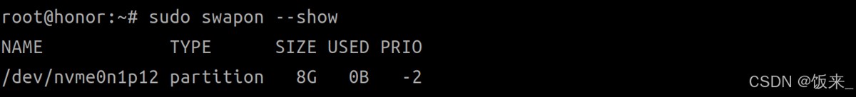 sudo swapon --show ---------------------------------- # swap 文件 name type size used prio /swapfile file 4g 0b -2 # swap 分区 name type size used prio /dev/sda2 partition 4g 0b -2 # /dev/sda2 是具体的硬盘类型,hdd/ssd