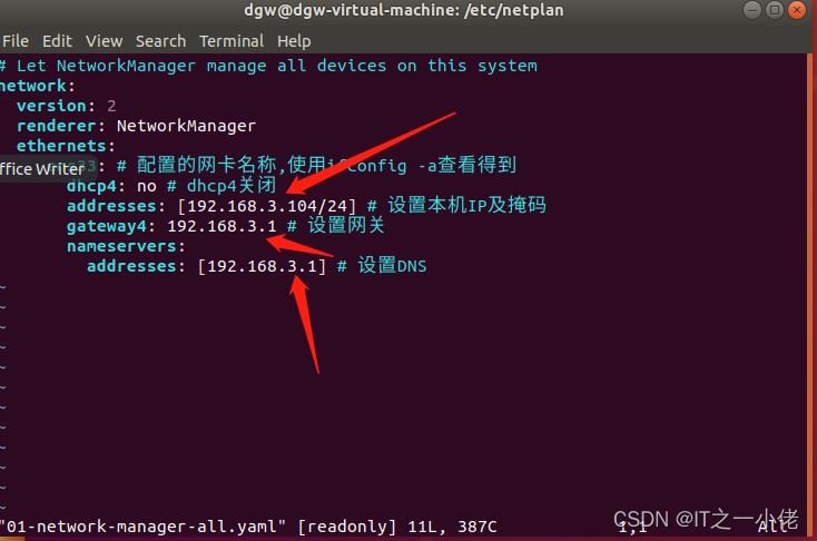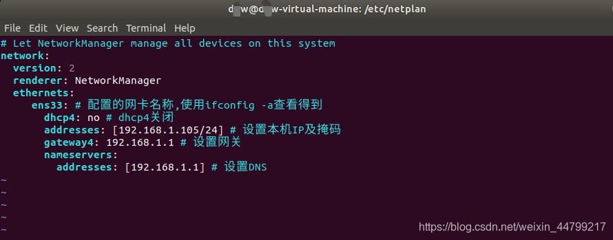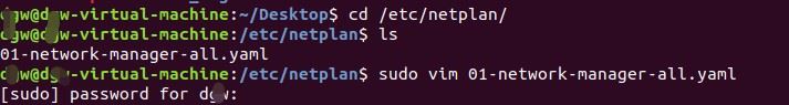 netplan目录下默认的网络配置文件,文件后缀为.yaml,我的是叫01-network-manager-all.yaml的文件。如果没有可以使用sudo gedit 01-network-manager-all.yam自己创建。